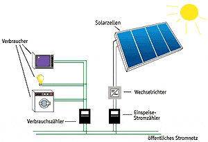 So funktioniert eine PhotovoltaikanlageUnter Photovoltaik versteht man die direkte Umwandlung von Sonnenenergie in elektrische Energie mittels Solarzellen. Solarzellen bestehen i.d.R. aus dem Halbleitermaterial Silizium.Photovoltaikmodule erzeugen Gleichstrom. Um den Strom in das öffentliche Netz einzuspeisen, wird jedoch Wechselstrom benötigt. Die Umwandlung erfolgt durch den sogenannten Wechselrichter. | ![]() |